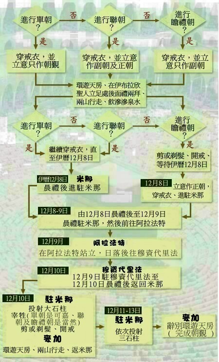 朝觐流程图 伊斯兰之光 2008-07-13 13:10:00 浏览 由于朝觐有多种,而程序及内容略有不同;为使读者易于分辨及掌握,现列流程表于后,希望有参考作用。 参考:《朝觐与副朝 由 Α 至 Ζ 》(朝觐手册)