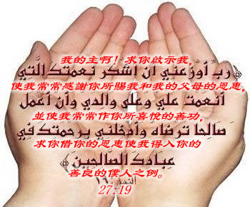 第七、祈求词简洁。 这是圣行,先知穆圣祈祷时,言简意赅,简单明快。 个人的心愿都允许诉说,祈祷中可以用本民族习惯的语言,因为只须把心意向真主表白。 如果能认真学会一些固定的祈祷词,如早起、晚睡、开始工作或出门旅行,用阿拉伯文诵念,这也是虔诚的表现,但祈祷以表真诚的心意为主要意图,大学者们意见,准许用自己的家乡话。