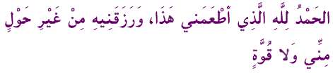 'Al-hamdu lil-lahi 'al-lathee 'at`amanee hatha, wa razaqaneehi min ghayri hawlin minnee wa la quwwatin.
