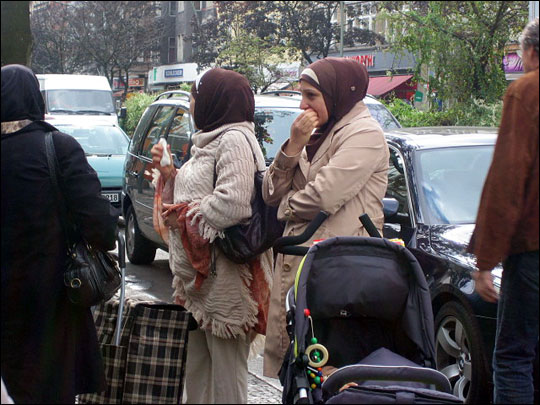 艾伦'乌莎尔是德国出生的土耳其姑娘,我在1999年第一见到她。 她说,父亲和母亲都希望她这一代成为真正的德国人。 她说:“我母亲从土耳其移民到德国的时候,心里不安,她把在家乡常戴的盖头丢弃在飞机上了,担心盖头会给她带来麻烦。” 今天,步行在柏林市内纽克恩(Neu-Koln)和克鲁兹堡(Kreuzberg)这两个居民社区,立即感觉到了某个穆斯林国家,街上行走的女子大多数都戴着盖头,有老人,也有年青人。 她们没有把盖头丢弃在家乡,或飞机上,她们在德国建立了自己的新家乡。 她们与土耳其中部安纳托利亚老家居民不一样,那里的女人都戴着传统的方巾,土法纺织的厚棉布,而德国的穆斯林女子的盖头实行全球一体化,轻薄的细纱,色彩鲜艳,她们所表现的形像,不是土耳其人,而是国际化的穆斯林女子。 在柏林市中心大街上,十年来,戴盖头的女子数量猛增,甚至有些年青女子穿最保守的伊斯兰宽敞长袍,盖头之前又加上一条面纱,只露出一双美丽的大眼睛。