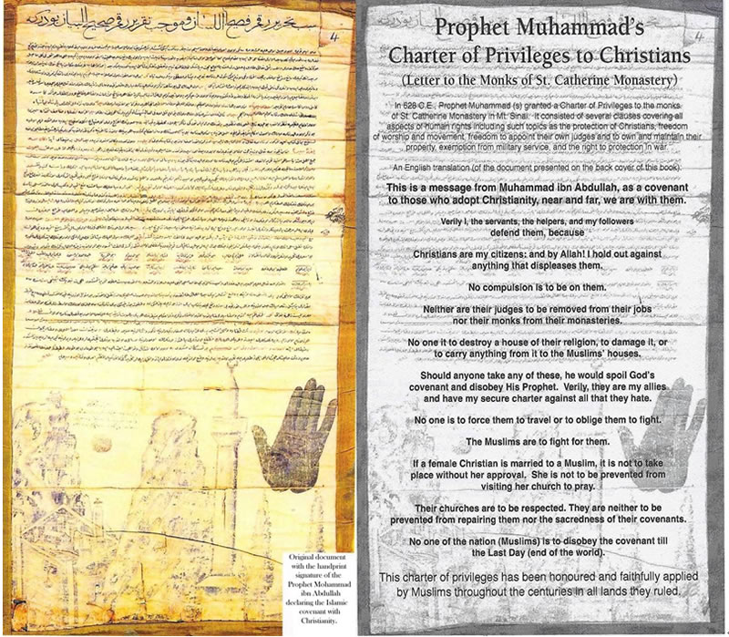 2000年,A•扎胡尔博士(Dr. A. Zahoor)和Z•哈格博士(Dr. Z. Haq)共同出版的著作《570年至1950年间的穆斯林历史》(Muslim History: 570-1950 C.E)中,记载了先知穆罕默德(愿主福安之)送给埃及西奈山圣凯萨琳基督教修道院修士的亲笔签名信,阐明了伊斯兰与基督教的关系原则。